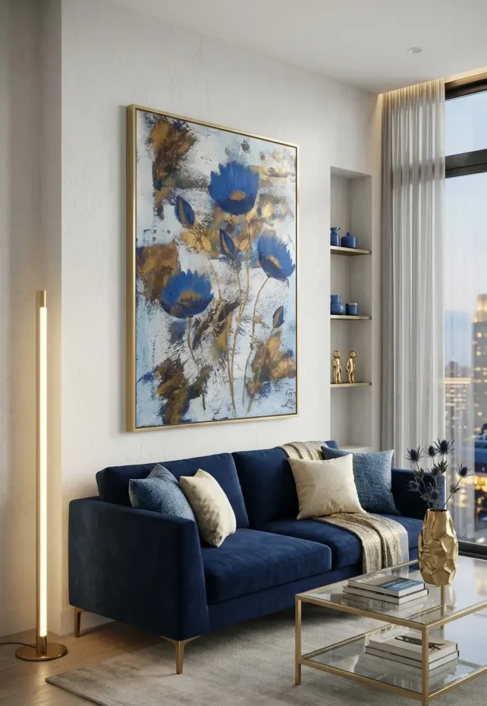 The true beauty of this work lies in its rich layering and tactile quality. The bold splashes of gold leaf against the ethereal blue blossoms create a sense of movement and luxury, making it a sophisticated centerpiece for any modern space. It is a testament to her unique ability to blend the wild spirit of nature with a refined, artistic elegance.