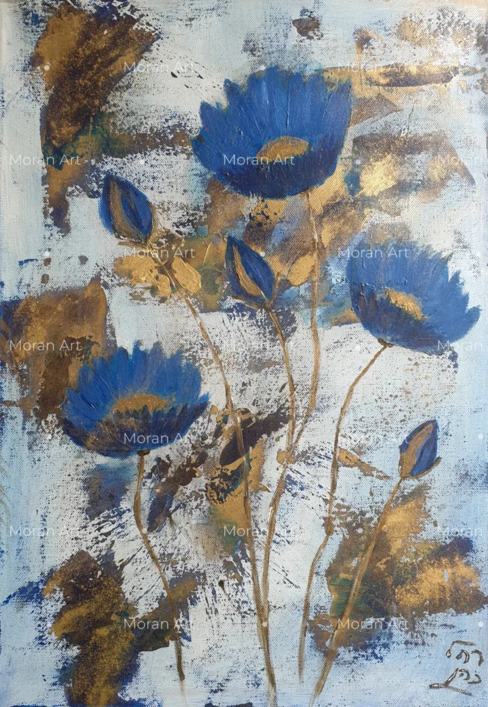 Painted by my mother, this exquisite piece is a journey into a world of texture and light. It captures the essence of a floral meadow through a dreamlike, abstract lens, where deep sapphire blues meet the shimmering warmth of gold. The composition feels both organic and magical, as if catching a fleeting moment of nature transforming under a golden glow.